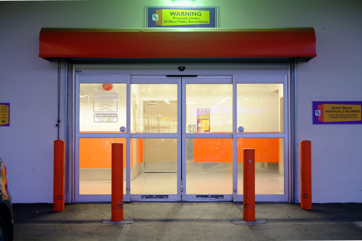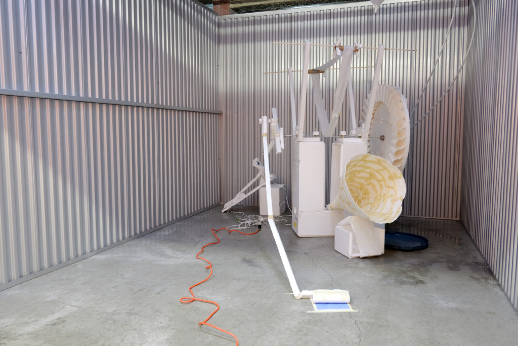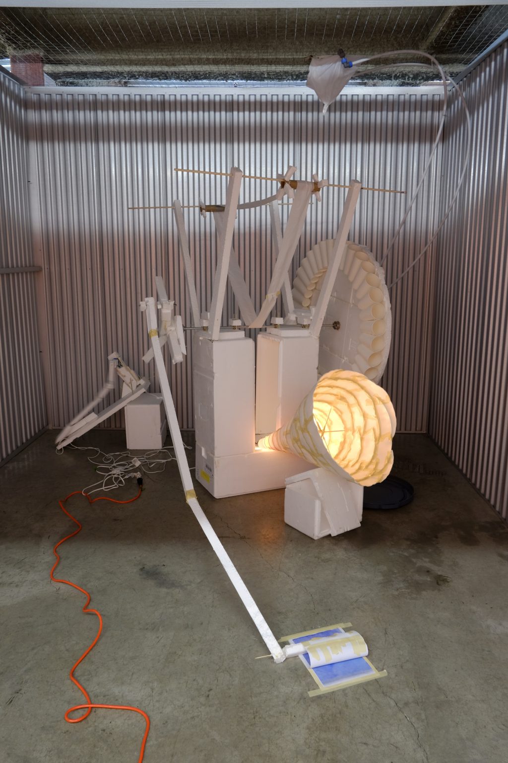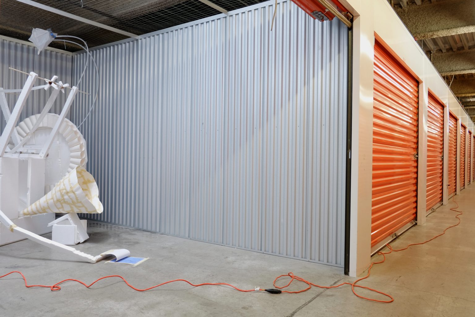 Byungseo Yoo is also well-known for his participation in Korea’s controversial reality TV show, Art Star Korea, broadcast in March–May 2014. The show featured fifteen contestants, a celebrity host and a panel of powerful arts professionals tasked with evaluating and eliminating one artist per week based on their ability to create modern art in response to specific challenges. Disposable Cinema (2014) was first presented on Art Star Korea in a segment requiring a group of five artists (including Yoo) to execute works on the theme of “temporary life”; after the exhibition, all the artworks were purposely discarded. This short-lived piece is being shown in Vancouver at Public Storage where people come to store the junk that clutters up their lives. Unlike all the other objects in storage, however, Disposable Cinema is the only one that forlornly continues its lonely mechanical labour behind the orange gate. Public Storage is a real estate investment trust (REIT), self— described as “among the largest landlords in the world.” As an exhibition space, Public Storage is entirely unique, as it lacks and even neglects any notions of productivity and movement. Without windows or a proper ventilation system, Public Storage is inadequate for human habitation, suited solely for the display of unused—even useless—objects. We situate Byungseo Yoo’s Disposable Cinema in Public Storage facility by renting a unit for a month to emphasize the futility of the arts within “corporatized” real estate/land development system, believed by some to be stifling the development of a vital arts economy in Vancouver.